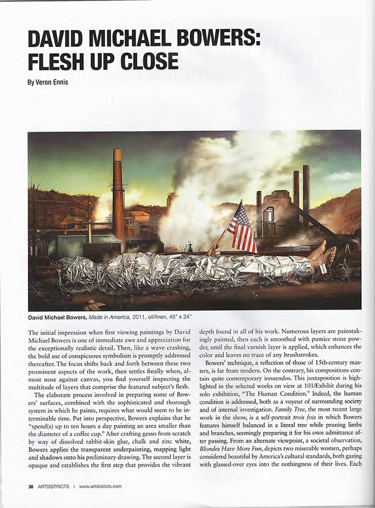 In 1991, David began his illustration career working mostly with book publishers in New York City in which he completed over one hundred book covers in the span of over ten years. Also, David's work graced the cover of numerous prominent magazines, including TIME. He also painted the portrait of J. P. Morgan for the cover of Cigar Aficionado , as well as the family portrait of the Rothschild family and the Chateau Latour Winery for the covers of Wine Spectator magazines. These paintings are now part of the publishing company's permanent collection at their corporate headquarters in NYC. Bowers's illustrations received numerous awards including three Joseph Morgan Henniger Awards, "Best of Show" from the Society of Illustrators of Los Angeles along with two Patrick Nagel awards. These awards recognized David with the best, published illustration of the year. Also, David received nine other medals recognizing his work from that organization. David also received numerous medals and Merit awards from the Society of Illustrators in New York, Spectrum and Communications Arts Magazine. As David transitioned into Fine Art, his work continues to be recognized by various organizations including the "Best of Show" from the American Society of Traditional Artists in 2014 and Best of Show from the International Guild of Realism, the "Jack Buncher Award" from the Carnegie Museum of Art in 2013, the "Best of Show" in 2011, "The Best Tromp L'oeil" in 2010 and "Pioneer in Realism" award in 2009 from the International Guild of Realism. David was recognized by The Art Renewal Center with the "Chairman's Choice Award" in 2013 along with the "Staff Award" in 2011 and in 2009 recognized as a "Living Master." David's painting titled, "Made In America" received the 1st place award from The Portrait Society of America in 2011 & 2014. Bowers was a semi-finalist for the Outwin Boochever Portrait Competition in 2009, National Portrait Gallery, Smithsonian Institution. Bowers has had exhibitions across America and Europe, including the Mendenhall Gallery in Pasadena, CA, Gallerie 224 in Laguna Beach, CA, Klaudia Marr Gallery in Santa Fe, New Mexico, 101 Exhibit in Miami, FL and Los Angeles, CA. Gallery Brusen in Denmark, Halcyon Gallery in London, England, Marcel Salome Gallery in The Netherlands and Germany, the Butler Institute of American Art, The Westmoreland Museum of American Art and is currently being represented by Palm Avenue Fine Art in Sarasota, FL, Gallery 126 in Denver,CO and The Winfield Gallery in Carmel, CA. Upon first glance, Bowers' works seems to take you back to periods of painting long gone. This is due to Bowers method of painting, which is reminiscent of the Old Masters, specifically the 17th Century Dutch. David has studied the masters for many years to develop his techniques, which involves multiple layers of paint called glazing and alla prima. The technique might be old, but his paintings incorporate modern themes and current symbolism, which he describes as "realism with an edge." Bowers' paintings are in many private collections throughout the United States and Europe as well as The Museum of American Illustration in New York and the National Portrait Gallery in Washington, DC. Bowers lives in Madeira Beach, FL with his wife Kimberlie, where he paints very meticulously and methodically day in and day out. Awards and Accomplishments2017 "Pioneer of Realism' International Guild of Realism at the Winfield Gallery in Carmel, CA 2016 "Best of Show" International Guild of Realism exhibition at Gallery 1261 in Denver, CO 2014 "Best of Show" International Guild of Realism exhibition at Robert Lange Studios in Charleston, SC 2014 "Best of Show" American Society of Traditional Artists 2013 ARC International Salon Competition, Chairman's Choice Award for the painting titled, The Messenger 2013 My painting titled, Strike Three will be at the Carnegie Museum in a group show starting April ,19 2013 (Jack Buncher Award) 2012 Portrait Society of America, Outside the Box, First Place Award for the painting titled, Made in America 2010/2011 ARC International Salon Competition, ARC Staff Award 2011 International GUILD of REALISM, BEST of SHOW Award 2010 International GUILD of REALISM, Best of Tromp L'oeil Award 2009 International GUILD of REALISM, Pioneer in Realism Award 2009 Semi-finalist Outwin Boochever Portrait Competition, National Portrait Gallery, Smithsonian Institution 2009 Living Master recognition from the Art Renewal Center 1992-2004 The Society of Illustrators of New York - honoured with several awards from the show, including over thirty Awards of Merit and also a Silver Medal 1997-2004 The Best of Fantasy Art Competition - numerous paintings have been chosen for publication in Spectrum's Fantasy Art Annual. Honoured with Gold Medals in 2001 and 2004 1994·2004 Society of Illustrators of Los Angeles - honoured with several awards from the show. including three Joseph Morgan Henniger Awards, "Best of Show" in 1997, 2002 and 2003; Patrick Nagel Award of Excellence in 2001 and 2002; Gold Medal, 1994; Silver Medals, 1995, 1996, 1998. 2003 and 2004; Bronze Medal in 1996 1995 & 2000 - 2003 Accepted in the prestigious Communication Arts publication. In 2003, a series of three paintings were accepted, titled "Ladies and Eggs" 2001 Awarded "Best of Show" - Society of Illustrators of Pittsburgh 1994 & 1997 Honoured with two Gold medals from The Pittsburgh Addy Awards 1996 A painting titled "Dead Pope' was selected for the Museum of American Illustrators' permanent collection 1995 Summit Award - Marketing and Advertising award for Art Institute International David also has two paintings (covers for TIME magazine) in the permanent collection of the National Portrait Gallery in Washington, D. C.