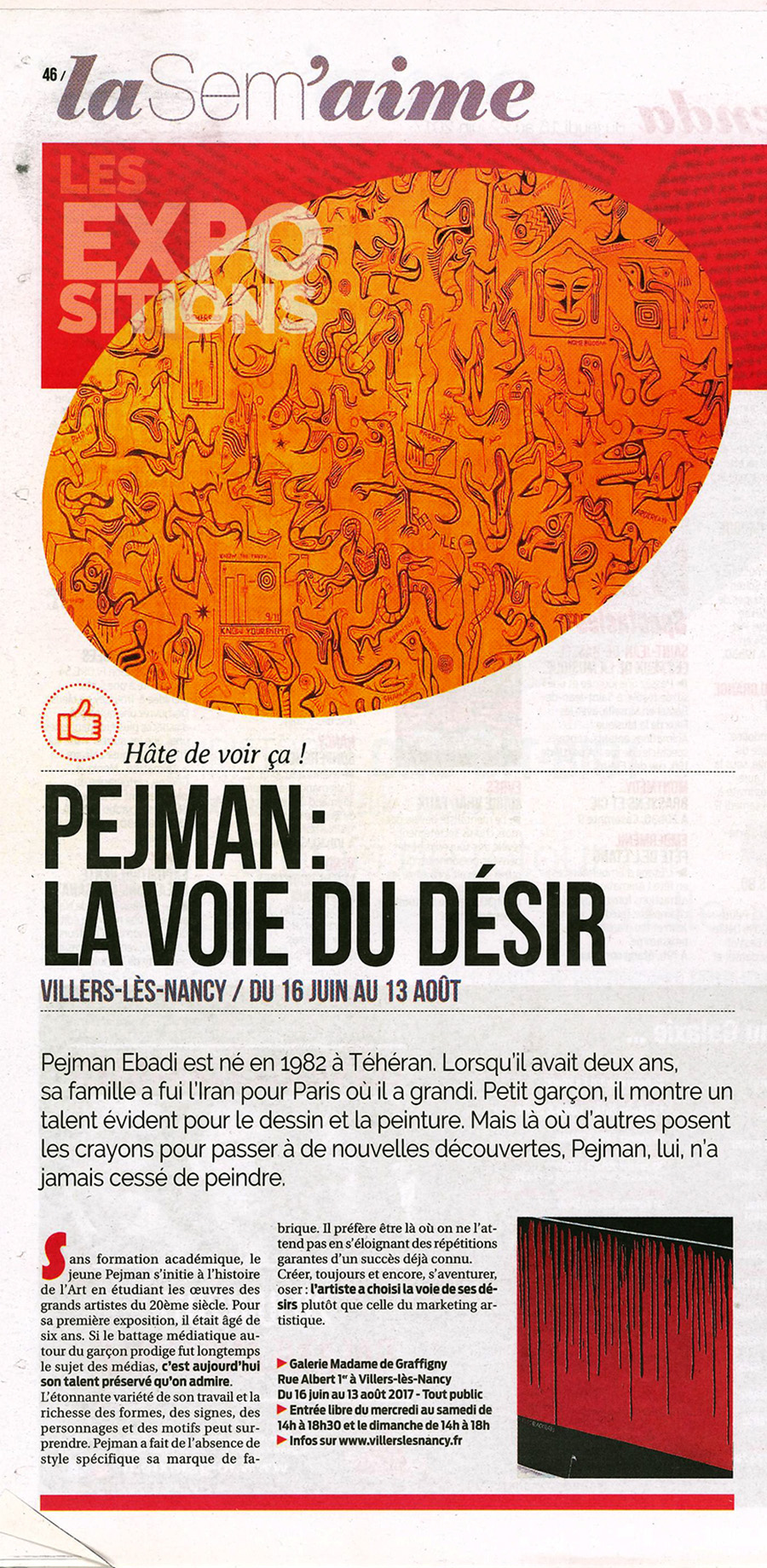 PEJMAN EBADI http://www.artelino.com/articles/pejman_ebadi.asp Pejman Ebadi had his first group exhibition in 1988 in Paris when he was six years old and his first solo gallery exhibition at the age of eight. His works are exhibited all over the world - Montreal, New York, Tahiti, Cannes, Hamburg, Lyon, Bern, Wuppertal and so on and so on. Born in TeheranPejman Ebadi was born in 1982 in Teheran. His family fled from the Ayatollahs to Paris where he grew up. The little boy showed an obvious drawing talent at an age when he was still at nursery school. Since then he has painted incessantly. A Prodigy ChildWhen Pejman was eighteen years old, he had created about 1,500 works of art. The list of his exhibitions has become very long. It looks like the exhibition resume of a middle-aged, internationally successful artist. The young man is fully integrated in his own success. Ebadi is usually present when a new gallery show of his paintings is opened. And it is not only the gallery shows that keep him busy. TV channels such as the main German and French channels report about him. Even Fuji Television Network from Japan or R.F.O from Tahiti broadcast interviews or special coverages of Pejman Ebadi. The hype about the prodigy boy is obvious, but his talent is too. The art works of Pejman reflect the experiences of an adolescent of our times. His images are often violent, aggressive, obtrusive. Others show subtle use of colors and compositions. Astonishing is the great variety and richness of forms, signs, characters and patterns. Pejman's use of color is anything else but arbitrary. The young guy definitely has a great talent. He must be more than the product of a smart art marketing manager. It is the absence of a specific style that shows his real talent. Young stars - no matter whether singers, musicians, actors or painters - often come up with a successful but limited gimmick. They become famous over night, then try to repeat the success again and again and disappear soon, because they are incapable of creating anything else than different variations of one pattern. What Next?Pejman Ebadi's paintings and drawings show elements of all kinds of styles and art movements. Some of his designs look a bit like Joan Miro, other like Picasso or Kandinsky. The young man has not found his style yet. It would be foolish to expect this at his age. And for his development it is better to experience the whole spectrum of modern art styles of the twentieth century. By the time this little article was written (2002), Ebadi has reached the age of twenty. The prodigy child era is over. One can only hope that he survived the hype about his person without taking any damage in his personality and his strive to become a great artist. Might Pejman Ebadi one day become a kind of "Picasso" of the twenty-first century? Only time can tell. His art work sells well. And his paintings and his drawings on paper are still very cheap. They might be worth a fortune in twenty years from now. Speculation should not be the driving force for buying a work of art. But it often is. If you like a work of art and have some prospects it might be something very important and valuable one day - why not. Regard buying an "Ebadi" as Pejman regards painting: a serious play. http://en.wikipedia.org/wiki/User:PhilipASkinner/Pejman_edabi Pejman (pronounced “Payshman”) Ebadi was a child genius. Born in Teheran, he has been painting watercolours of extraordinary depth and sophistication since the age of four. They look like initial sketches from the studios of Paul Klee and Kandinsky. His first solo exhibition was in 1990 when he was eight years old and by the time Ebadi was eighteen years old, he had created around 1,500 works of art. He has no academic artistic training and, rather than using an easel, fixes his supports straight onto the wall or floor. Ebadi’s work expresses the personal views, emotions and experiences of an adolescent absorbing his responses to the world around him. His powerful line drawings often create intense, violent and confrontational images out of a disharmony of colours and a mixture of French and English text. He has had thirty-six solo exhibitions in worldwide venues, including the Villa des Arts in Strasbourg, the Espace Pierre Cardin, Paris, Christian Zeller Gallery, Bern and also in Berlin, Montreal, Toronto, Tahiti, culminating in a Retrospective exhibition at the Arsenal in Metz in 1990. Pejman is now 25 years old. Grosvenor House is the first public showing of a major work by Pejman in Britain.