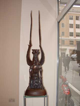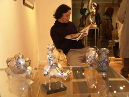ONCE again Hay Hill Gallery has brought to London the delights of Russian Art with this stunning exhibition of Dashi Namdakov sculptor and alchemist. Namdakov's lyrical and liquid figures cast in bronze and silver conjure the vast expansiveness and mystery of Russia's non-western plainsmen and indigenous people. Dashi Namdakov, born in 1967, lives in the South Eastern part of Russian Siberia, in the Chita region, near the Russian-Chinese border in a small Buryati village near the world's cleanest and biggest fresh water container, Lake Baikal. His father was a well-known village craftsman with versatile talents, making things by hand, furniture, metal handles, carpets and wood-carved sculptures. Working At 18 Dashi moved to Ulan-Ude, Buryati's central city, and started working with the well-known sculptor Gennady Vasilyev. Two years later he entered the University of Fine Arts in Siberia's Krasnoyarsk City, where famous Russian artists Lev Golovnitsky, Yuri Ishkhanov, Azat Boyarlin and Eduard Paklhomov taught his academic art. Dashi Namdakov has been nicknamed the alchemist, observing the beauty of the natural world around him and recreating it in metal. His roots take in both the ancient traditions and the modern history of his country and culture. You find in his sculpture a mix of traditional images of remote Mongolian steppe civilisation from Central Asia - its warriors and beauties, its shamans, totemic animals and mythological creatures. His creations delight the eye and the imagination, making us believe in the reality of story telling. His pieces are strongly influenced by the oriental culture of the east where man and the universe are united, and where everything is an integral part of the ‘universal construction’, and yet he was influenced by Michelangelo. Breugel and Japanese art. Namdakov himself says: 'From my village to New York, I do not have words to describe the distance.' But his technique and craftsmanship, his knowledge of contemporary and modern art forms, testily also to the unifying process of the Soviet workers' revolution of October 1917, which liberated the peasant from ignorance and brought education, art and literature to the remote parts of the region. A revolution which made it possible for a young 'peasant lad' from the remotest inhabited regions to develop and train in the leading Art School in Siberia and to show his art in the State Hermitage, the State Museum of Oriental Art, and the Russian Museum of Modern Art. Dashi Namdakov transforms metal into silky creatures with a liquid and lyrical movement, imagined figures are made extremely tactile. His creatures have a tremendous energy and a magical power to awe, but with a lightness and humour, which delights the eyes and tickles the mind. Warriors and archers feature in Namdakov's work, broad and powerful and yet whimsical and mystified, pitted against a more powerful and mysterious natural world. For the artist, the concepts of a warrior and a sage were one. There are many horses in Dashi's work, reflecting the life of the Mongolian herdsman. In one Chinese legend a Stallion falls in love with his Master's daughter and was shot with an arrow for his troubles. But the Stallion’s skin wraps up the girl and carries her into the steppe where she is transformed into a a strange creature – a huge mulberry silkworm with a horse head, becoming the Goddess of silk-spinning. There is the delightful work called, The Rich Fiancee, in which a young woman riding a stylish mule, laden with a small travel trunk, twists on the horse, looking back at a crowd perhaps as she commences her journey. The ass she rides twists its neck 180 degrees to face the rider, but its eye looks out at the viewers, to bring them into the joke. The Pearl depicts a young woman balanced lightly on a plinth, toes curling upward and skirt blowing round her knees, her head turned away, and in her hand a large pearl. This was cast in three different colours of bronze, highlighting and shadowing and giving the sculpture a depth of texture. The Steppe Nefertiti is the head of a Mongolian woman in the style of the famous Egyptian queen. She is beautiful and peaceful and calm. Dashi prefers to work in bronze as the most visually expressive material. But he has used other materials and techniques. Two of his pieces The Bet and Raven-bird are made of felt and horsehair. Not exhibited but seen in the catalogue. Also featuring in this small friendly gallery hanging above his sculptures are Namdakov's giclee prints of his warriors. This is a new printing technique developed in France where pencil drawings can be projected onto canvas. Dashi creates his own mythology. He re-organises anthropomorphic features and invents fantastic bodies. She-Guardian is a sabre-toothed, winged, wonderful, mythical gargoyle-like creature with eight milk-full teats prancing on claws, staring wide-eyed and warning anyone who comes near. Suggesting the power of nature and of human sexuality, his erotic He and She of redwood and bronze are facing each other - two statues with the heads of gazelles and human bodies, one with women's breasts and six teats, the other with a full erection. The sculptor said: 'Each thing or idea has its own inner logic which dictates the form of expression ... by understanding and following the logic one creates a wholeness out of details.' This is a delightful exhibition and well worth a visit to this friendly gallery.