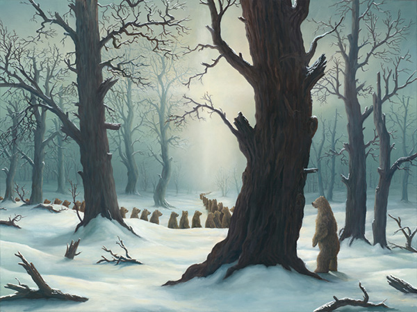 At first glance, Robert Bissell’s art suggests the struggles and triumphs of animals through a narrative painting style reminiscent of illustrative children’s books. But within Bissell’s work lies a more profound message. Familiar animals from our collective childhood, including bears and rabbits, are purposefully set in magical yet realistic landscapes to disarm viewers and draw them in. Once inside Bissell’s art, viewers discover that the quizzical, contemplative, menacing, or exultant animals actually represent us. Bissell then takes us on an unexpected journey, where in the end we realize that we are not separate from nature, but rather are part of it. Bissell’s initially disarming style is just the first layer of his intent, beyond which his art poses challenging and essential questions of what we are. His message is that we are ultimately part of nature, something we may have forgotten.