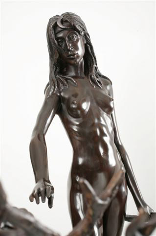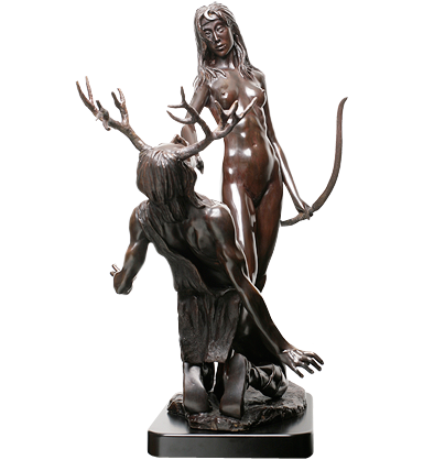 Sculptor’s Interpretation: “I have been greatly influenced by Bernini’s marble masterpiece of APOLLO AND DAPHNE in the Galleria Borghese, Rome. Apollo, Diana’s twin brother, also god of archery and of the sun, was the victim of Cupid’s (Eros) golden arrow which made him fall madly in love with the beautiful nymph, Daphne. However, Cupid shot Daphne with a lead arrow to make her reject Apollo, so we have the climax of Apollo’s fiery passion and Daphne’s cold resistance. The conclusion: just as Apollo grabbed Daphne she called upon her father, Peneus, the river god, for help, and she was immediately transformed into a laurel tree. Thereafter, in perpetual eternal mourning for his lost love, Apollo wore a headband of laurel leaves. “The Master Bernini successfully captured the moment and the metamorphosis when Apollo grabs Daphne who is turning into a laurel tree before his eyes. “My interpretation of ACTAEON’S metamorphosis starts with a very regal, very angry DIANA, whose nude privacy has been invaded by the eyes of a man. She has stepped out of her bath. Her long wet hair clings to her body. Her first instinct as goddess of the hunt was to grab her bow and destroy ACTAEON with one of her silver arrows. Instead, she decides to spare the handsome hunter’s life by throwing water on him, turning him into a stag, not realizing that his own hunting dogs would turn on their master. “My DIANA casts her spell on ACTAEON who kneels at her feet, helpless, pleading for mercy as the metamorphosis starts to take place, full stag’s horns already sprouting from his head. “I’m no Bernini, but I think I captured the moment. “This is intended to be my last DIANA. However, when I was recently in London, I photographed the current Miss Universe, who has also been a ballerina. If I can work out logistics so she can pose for me, there may be a Fourth DIANA.” RICHARD MINNS