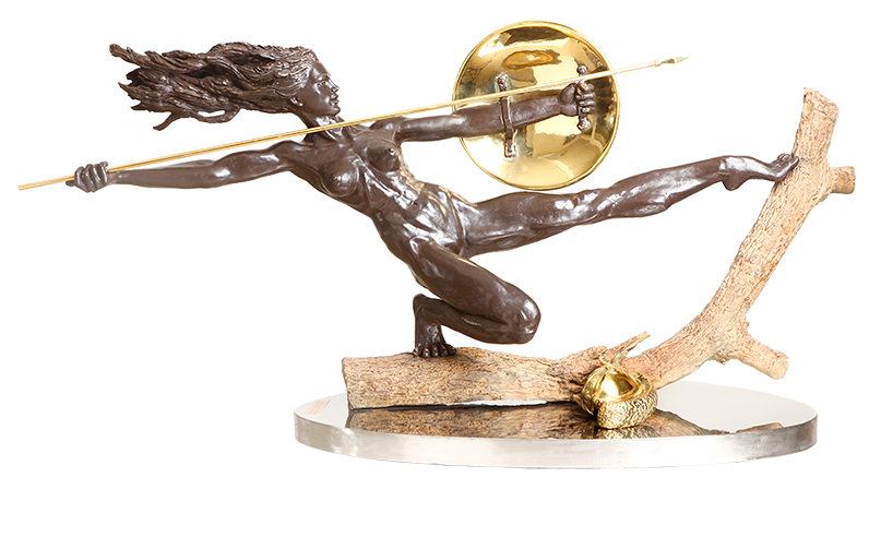 SCULPTURE Richard has created a supreme female athlete with a body reflecting physical excellence, capable of throwing her long heavy golden spear further and with more power than any man. Yet she is beautiful, graceful, feminine and extremely erotic. Her outstretched left leg is the leg of the most beautiful ballet dancer. Notice the delicacy of the way her breasts are curved, with such gentleness in the curves flowing out to the nipples, the firm flesh below the breasts swelling slightly around her muscular belly and then curving back into the pubic area. Her long legs, starting with firm perfect thighs, reflect the perfection of her legs. Note her beautiful back and luscious firm buttocks. The patination of the bronze is in Classic Rodin Style: first, a rich brown undercoating and then a black overcoating, so when the light dances on the sculpture the brown undercoating shows through. The gold shield, spear and helmet (which is cast in brass and then highly polished) gives a wonderful contrast to the rich patination of the bronze figure. Richard Minns