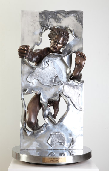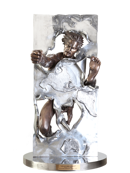 Leon Bronstein The above tribute to Richard’s skills is easily evidenced by his Atlas Shrugged Quadrilogy. In Richard’s hands, clay, wax, plasticina, bronze, stainless steel, brass and aluminum have been transformed into figures that manifest the human condition. Richard understands the possibilities of the male and female nude and the spectacle of muscles in movement. Every inch of Richard’s Atlas Shrugged sculptures, from head to toe, convey the total spectrum of human emotion. ATLAS SHRUGGED I: ESCAPE TO FREEDOM literally EXPLODES with POWER as Richard’s Atlas SMASHES his way out of the word, reaching out to FREEDOM. Richard’s Atlas I is the embodiment of physical force. As you turn the sculpture around on its turntable, you will note from Atlas’ toes to his fingers, from his calves to his thick legs, powerful buttocks and explosive back, every muscle in Atlas’ body is in play. Atlas I is Richard’s opportunity to display his mastery of human anatomy and to show an athletic young male body at the height of physical excellence. Atlas is cast in Bronze with a classic rich dark brown patination. The Wall (representing the world of Collectivism) is cast in highly-polished Aluminum, reflecting a mirror image of Atlas. The Base is highly polished Stainless Steel, also reflecting a mirror image.
