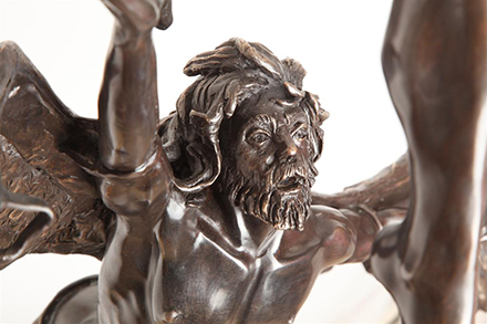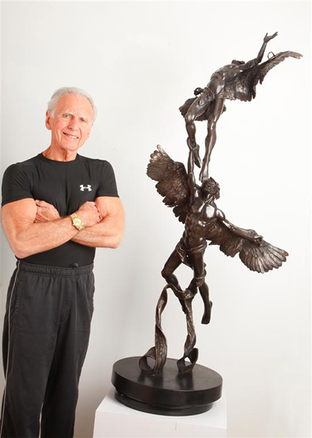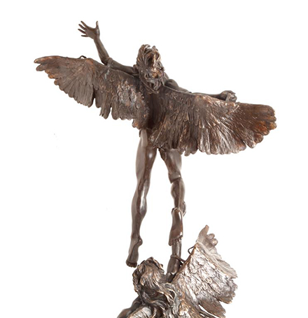 SCULPTURE’S DESCRIPTION Icarus is at the top, exhilarated with his ability to fly, and he is flying straight for the sun … and his doom. His father, Daedalus, is flying safely below, right arm outstretched high, holding his son’s ankle, attempting (in vain) to restrain him. Actually, Flying Too High (Daedalus and Icarus), where Icarus is flying straight for the sun and his father Daedalus is frantically trying to restrain him, is a companion sculpture to Icarus’ Final Moment, where Icarus (in mid-air), is about to crash into the sea, his body contorted in perfect Greek Pathos, his melted wings hanging limply under him. This sculpture is first a masterpiece in engineering and architecture. In order to show Dadealus and Icarus soaring high in the air and to create the illusion of defying gravity, Daedalus is flying in one direction and Icarus is flying in the opposite direction, creating a horizontal “V” shape so that the center of gravity is perpendicular to the center of the two bodies allowing the sculpture to stand solid and firm, but clearly giving the illusion of defying gravity … and FLIGHT! The relationship of the bodies of Daedalus and Icarus has maximum grace and fluidity of form, expressing power, emotion, conflict and maximum movement. It is a beautiful ballet of forms in the air. The expression on Daedalus’ face, anguish and concern over the fate of his disobedient son, is in contrast to the expression on Icarus’ face, exhilaration and rapture in his freedom of being able to fly. This is the original prodigal son story. The surface modeling is vintage Richard Minns at his best. No detail is overlooked … from Daedalus’ windblown hair … to Icarus’ wild hair covering his left eye … to every feather on their wings … to the stirrups which hold the wings to their arms. Nothing misses Richard’s watchful eyes. This sculpture LIVES! ARTIST’S