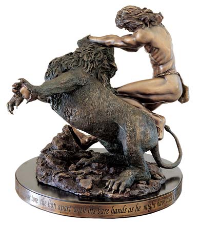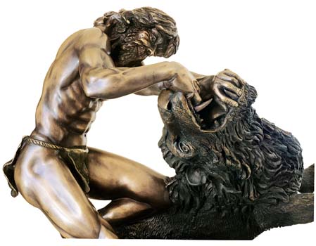 Description of Sculpture Richard's Samson Slays the Lion is a beautiful ballet. A dance. This supreme primitive life-and-death battle of man against beast, muscles and sinews against muscles and sinews, culminating in a balletic dance of death, has fascinated artists, sculptors and writers from the Greek and Roman Old Masters to Hemingway. This sculpture is another example of Richard's mastery of anatomy. This time Richard exhibits his mastery of the anatomy of the lion as well as the anatomy of man. The architectural design of the sculpture is itself a work of art. The front view shows that Samson and the lion are separated, with Samson's head and weight directed to the left, whereas the lion's weight and head go to the right, making a perfect “V”. Note the wonderful muscular development of Samson's back and shoulders; his powerful deltoid and tricep muscles; his determined face, where he is biting his lower lip; the strength of his left knee buried into the lion's back; the toes of his left foot digging into the lion's fur; his right leg rigid (the source of his body's power) and braced against the stone. This is a sculpture of which you will never tire, because every time you see it, as the angle changes and the lighting changes, you will observe something new and exciting.