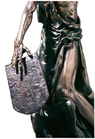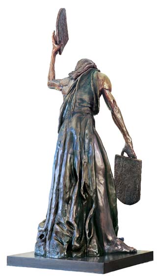 Artist's Interpretation: “I must give you some background, which you already know, so I can properly convey my passion. My MOSES has spent 40 days and 40 nights on Mount Sinai. His people did not believe any man could survive this long on Mount Sinai, alone in the wilderness under the scorching sun without food or water, so they were sure that MOSES had perished. They lost their faith, which was largely based on their reliance on MOSES strength and indomitable will, which enabled him to deliver them from Egyptian slavery across the Red Sea to freedom. With their belief that MOSES had perished, they lost faith in MOSES and in G-d, reverted to their pagan ways, and started worshipping the golden calf idol. “MOSES did survive and when he arrived, barefoot, with his clothes in shreds, half-starved, but exhilarated, with the two Commandment Tablets from G-d, he was horrified at the above sight. He was betrayed. G-d was betrayed. The once-coveted Tablets become burning red-hot coals in his hands. He can't bear to hold them any longer. Tired, but overwhelmed with the shock of betrayal, my outraged MOSES is throwing the Commandment Tablets to the ground. His right arm has swung down. The tablet has left his outstretched hand, and I have tried to convey the impression that the tablet is in the air, falling. MOSES left arm is raised over his head preparing to hurl down the second tablet. “Anatomically, my MOSES is old, very lean, starved, with ribs protruding, but still a very strong man with old but firm muscles and tendons attesting to his work as a shepherd. I have over-emphasised the veins on his arms and hands to combine strength and strain with pathos. I have tried to capture the mixture of sadness, shock, despair and rage in his weather-beaten face and eyes.” MOSES face, eyes and hands dominated my dreams. I could think of little else until I completed the sculpture.” Richard Minns |