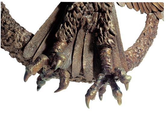 “I formed the original sculpture 100% in wax and was able to produce some unusual effects, which one cannot achieve in clay or other media. For example, for the large wing and tail feathers, I poured out sheets of molten wax, then I hand-carved every single feather, carving each rib in each feather. After which I carefully sculpted them together. There are over 80 individual feathers. I let the wax melt and run when I sculpted the legs, talons and the neck feathers, to achieve a very impressionistic effect.”