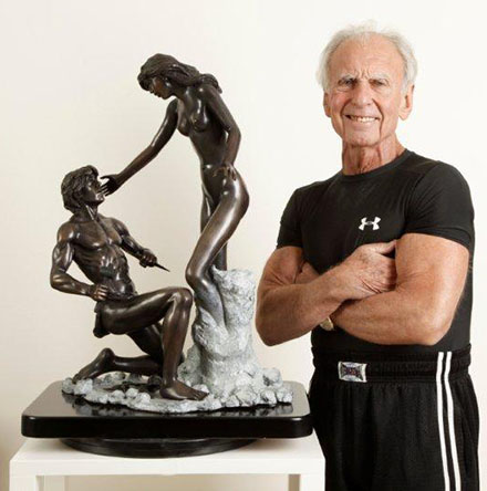 RICHARD L. MINNS Medium-size table top bronze. Classic potash rich dark brown patination on Pygmalion and Galatea. Black patination on Pygmalion’s sculptor’s tools. Special grey/white marble patination on ground and marble part of Galatea’s statue. 79 cm high x 54 cm long x 37cm wide, 31 in high x 21 in long x 15 in wide. CLASSICAL MYTHOLOGY As written in Ovid’s Metamorphosis, Pygmalion was a very handsome and very famous young sculptor in ancient Cyprus who wanted to marry and raise a family, but he could not find a woman who measured up to his standard of perfection. Therefore, he summoned all of his great skills and created the perfect woman out of a block of marble, then falling hopelessly in love with his creation. Pygmalion prayed to Aphrodite (Venus), the goddess of love, who gave the marble statue the gift of life. Pygmalion took his creation in his arms and since her fair skin was as white as milk, he named her Galatea, after the Greek word for milk. They had a son, Paphos, and the Cyprus city of Paphos bears his name to this day, preserving the story for all eternity. DESCRIPTION OF SCULPTURE The basic Pygmalion story has made its influence in literary / art / musical history more than any other Greek myth as each generation of artists, sculptors, writers, poets, playwrights, composers and musicians continue the Pygmalion concept in art, sculpture, literature, theatre, opera and cinema. First to come to mind is George Bernard Shaw’s award-winning play “Pygmalion”, which was turned into the award-winning stage and screen musical “My Fair Lady”, starring Rex Harrison as “Professor Higgins” and Audrey Hepburn as “Eliza Doolittle”. The seemingly endless list of branches from the Pygmalion tree includes “Phantom of the Opera”, “Educating Rita”, Nathaniel Hawthorne’s “The Birth-Mark”, Oscar Wilde’s “The Picture of Dorian Gray”, “Pinocchio”, even Mary Shelley’s “Frankenstein” and even the Simpsons’ episode entitled “Pygmoelian”. Artists and sculptors who have given their interpretation of Pygmalion include Auguste Rodin, Francisco Goya, Honoré Daumier, Edward Burne-Jones, Paul Delvaux, among countless others. Richard now enters the classical ring with his interpretation. Richard’s Pygmalion, his sculptor’s chisel in one hand and hammer in the other, is kneeling before his marble creation of Galatea, making the final touches. He hears a movement and laughter above him and looks up to see to his surprise and delight that Venus (Aphrodite) has granted his prayers and his creation has come to life. Galatea, laughing, reaches out to her lover, touching his cheek. To effectively portray this metamorphosis, Galatea’s upper half (the part which has come alive) is in bronze (like Pygmalion), where the lower part of her legs is still in marble. To create contrast and drama, the ground is white marble, which stands out on the ivory black polished base. Pygmalion’s sculpture tools are scattered on the white marble ground. The tools are covered with a black patina, in stark contrast to the white ground. Pygmalion and the part of Galatea which has come alive has a classic potash rich dark brown patination to effectively portray Galatea’s metamorphosis. Now the beauty of this magnificent bronze and marble sculpture is that the sculpture is 100% bronze and there is no marble on it. The white marble block, which Galatea is breaking out of, and the white marble floor is not real marble. Richard can create a bronze sculpture which looks identical to marble. This is the beauty of having a patination master and Richard’s foundry has one of the best in the world. ARTIST’S INTERPRETATION “I am an ex-Journalism professor and a frustrated “Story Teller”. I get great pleasure writing stories and reading them, first to my children (now grown), then to my grandchildren (now grown), and presently to my great grandchildren.” “The purpose of my sculptures is to tell a story. If my sculpture needs to be explained to the viewer, then I have failed. My sculpture stories are about the heroes of the Bible and the heroes of classical mythology. (Of course, it helps if the viewer knows the story.)” “My interpretation of Pygmalion is a young, handsome sculptor with a pleasing trim athletic body, but certainly not a Hercules, Samson or an Achilles. Galatea is the perfect woman – or at least Pygmalion’s concept of the perfect woman for him. Slim, feminine, with large eyes and Angelina Jolie lips.” “By casting the entire sculpture in bronze and relying on my patination expert to simulate marble, I was able to show a mixture of classic potash and white patina slowly blending together on Galatea’s legs. Look close. I think you will like it.” “I could say more, but I will let me sculpture speak for me. If you feel I have effectively told the Pygmalion story, then I have succeeded.”Richard L. Minns