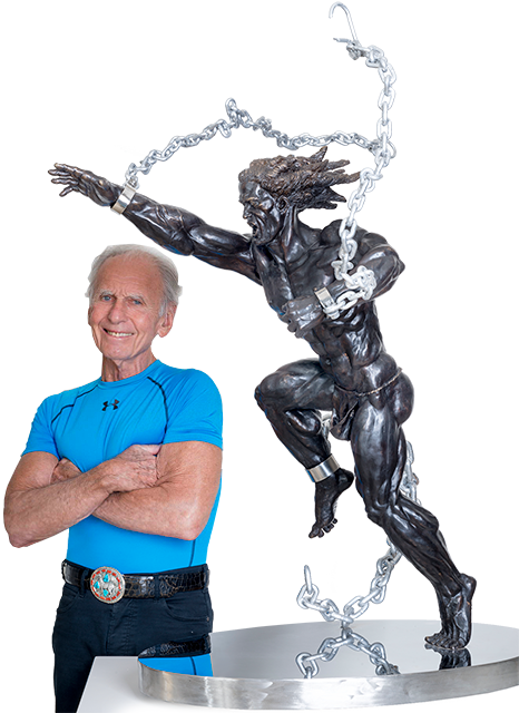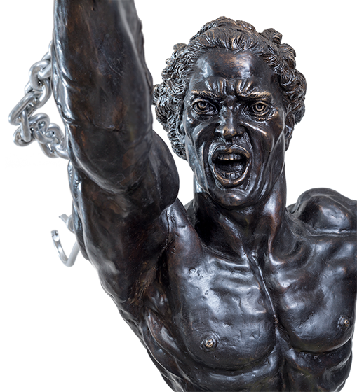 "My SPARTACUS, the ‘Ultimate Warrior’, has broken loose from the chains which bind him, and he is escaping to freedom. The chains, which fly in the air as he runs and charges forward, are an integral part of the sculpture.  His every muscle, ligament and tendon strain to anatomical perfection."