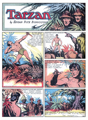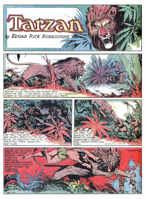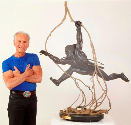 (audio sequence extracted from one of Weissmüller's Tarzan movies) RADIO AND TELEVISION Tarzan has been and remains the hero of many popular radio programs (now over 1,000 radio programs) and has been a primary television force for the past 100 years. TARZAN LIVES! TARZAN ANIMATION AND ANIMÉ Disney’s animated Tarzan (1999) marked a new beginning for the Ape Man followed by the Japanese Animé “Jungle, no Quja Ta-chan” (King of the Jungle Ta-chan) series. TARZAN LIVES! TARZAN COMICS Tarzan has also dominated the comics for almost 100 years. Tarzan became the immediate hero of United Feature Color Sunday Comics decades before other comic heroes (Superman, Batman, Spiderman, etc.) were conceived and before DC and Marvel Comics (Iron Man, Hulk, Thor, etc.) was even born. Hal Foster, the famous Canadian illustrator who changed the face of comics with his Prince Valiant series, was selected by Burroughs to depict his Tarzan. Foster put his mark on Tarzan from 1929 to 1936. Then, in 1936, the great unsurpassed illustrator and master anatomist Burne Hogarth undertook to draw Tarzan. At this time, Tarzan, the “Lord of the Jungle”, had already been in existence for 22 years in the novels of Edgar Rice Burroughs; he had been a character in the movies for 20 years; he had been a comic strip hero for 18 years. A student of Michelangelo and the great Baroque artists, Hogarth brought his illustrator’s skills and anatomical mastery to establish a new lasting image of Tarzan for United Features and the world, raising the level of comics to an art form. TARZAN LIVES! “They say it is never too late to have a happy childhood. So, pushing age 84 this 17 August, I am now enjoying my second childhood.” “As I get older, I go back to the days of my youth and my wonderful memories of Edgar Rice Burroughs’ Tarzan, the gripping cliff hanger Johnny Weissmuller black-and-white movies with his classic Tarzan Yell, Burne Hogarth’s pace-setting anatomical Tarzan comic strips, and even Walt Disney’s contemporary Tarzan animation.” “My TARZAN is young, muscular, slim. He is airborne, defying gravity as he soars through the trees swinging from vine to vine, long hair wild and flowing, exuberant with his mouth wide open as he gives his famous Tarzan yodel yell. I have added his Leopard Skin Loincloth, his knife, bow and quiver of arrows. Finally, he is surrounded by Jungle vines and trees. His outstretched left arm grips a vine as he soars through the air. His outstretched right arm reaches out for the viewer.” “There are two bases: The first base has a hidden turntable inside allowing the viewer to rotate the sculpture around at will. The first base sits on a second base. This base has a special sound system enclosed. A button in the base, when pressed, will activate a recording of Tarzan’s classic yell ... which will fill the room and let everyone know that “TARZAN LIVES!” “I’m having fun! Life is good! After all, it’s my second childhood.” “I hope you enjoy this sculpture half as much as I enjoyed creating it.” Sincerely