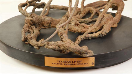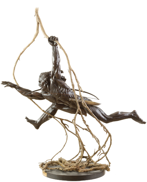 Yours, DESCRIPTION OF SCULPTURE The description of Richard’s “Tarzan Lives” sculpture should first be preceded by the following analysis of “How I Imagine Tarzan” by Burne Hogarth, the incomparable artist who defined Tarzan for United Features Syndicate and for the world. “HOW I IMAGINE TARZAN” (By BURNE HOGARTH, 1967) Burne Hogarth, the legendary anatomical artist / writer, who collaborated with Edgar Rice Burroughs to create the Classical United Features Comic Strips which defined Tarzan’s image, explained his own interpretation of Tarzan in “How I Imagine Tarzan”, a chapter in Tarzan, Seigneur de la Jungle (Paris: Azur, 1967): “To begin with, let me assert that Tarzan is, in a way, not a person at all. He is in a real sense the antithesis of the figures in literature and romantic fiction who are called ‘individuals’. He is no one man but man himself. He is a true Hero.” “Tarzan, to be understood clearly, must stand singularly free from the many general definitions of Hero. Tarzan is unimpeachably an authentic hero. He is the epic man. He is a modern archetype of that class of more-than-ordinary, universally recognized beings who leap to magical life in daydreams. He is the ideal hero, the sublime champion, the emancipated other side of ourselves, released from the oppressive prison of our routine existence. He is that nostalgic part of every one of us, born of ourselves and of our image, invincible and deathless. He is the incarnation of our secret desire to be free from every form of insignificance, frustration, and degradation. He is our own alter ego, our liberated second self of concentrated power, grandeur, and magnificence.” “To me, Tarzan represents the best of men everywhere. His aspirations are of the highest because there are no base motives in him. In his world, there are no greater or lesser persons, no higher or lower peoples. Before him all men are equal. Nor does he merely believe in equality. He believes in acts that are virtuous and humane.” “In another sense, Tarzan is a symbol of equality in that he rejects the role of the victim and resists the status of the oppressed. In his dangerous environment, he is able to bring his great physical and mental powers to bear against the unreason of the brute world of nature and the brute nature of man, and with a fierce effort against supreme odds, to triumph.” “As he will not be a victim, a servant or a slave, neither does he desire to be a master. Although he is ‘the Lord of the Jungle’, he is no lord. If Tarzan is a man of the elite, we must understand that his superiority does not come from rank or riches, but from freedom. His ethos is based on the innate free estate of all men. He seeks neither power nor control of the subservient. His desire is for autonomy rather than coercion, self-control rather than imposed discipline. His ‘lordship’ is therefore no over-lordship.” “He is always the exponent of justice, the even-handed dispenser of wisdom, the impartial guardian of fair play. He is the antithesis of vainglory, and self-conceit. Without pretension he is generous – and gains in the giving when he has nothing whatever to gain for himself.” “There is something about Tarzan that is archaic and venerable. He is capable of inspiring an extraordinary feeling of respect and of generating an enormous aura of dignity. He has a charismatic personality which one associates with visionary leaders, prophets, and messiahs. His presence commands instant courtesy and radiates authority. He can be lofty and remote; yet he is not aloof or unapproachable. While he can be unswervingly staunch and firm on matters of principle, he is warm and compassionate about matters of immediate need.” “In spite of all these exalted qualities, Tarzan is nevertheless human. He is not above pleasure, nor beyond pain, and is certainly not free from misjudgment and error. He is not invulnerable. He is capable of suffering. He can be reduced to afflictions and grief. He is no superman. He has no super powers to make him unconquerable or invincible. His human skin is not impenetrable. He is not an Alien from an advanced planet with super powers or an immortal Greek god from Mt. Olympus. Bullets will not bounce off his chest. Since he is only a mortal man raised by the Great Apes, bullets (and arrows and spears) will kill him. He has no arsenal of thunderbolts, cabalistic charms, or supersonic missiles.” “His only practical weapon of defense is the age-old, primitive device, the long-tooth, the knife of the dawn man in the morning of time. His weapon of attack is the same as that of any man, his intelligence. He survives, in a brutish world, by stratagems of test and trial. Hence, his passion is never irrelevant and his energies are always directed to a purpose. If he is capable of suffering, pain has a purpose and is never an end in itself. For this reason his battles are never fanatic and he never becomes intoxicated with acts of martyrdom.” “In his adventures, he is never rash or extravagant. He is born of trial and danger, but, wherever he goes, be brings reassurance and peace. He is energy, grace, and virtue. … He symbolizes the inevitable life source, the earth, the seed, the rain, the harvest, the achievement, the triumph over adversity and death. …” “He is a being who comes from an earlier time, sweeps comet-like through our lives toward another world, and leaves something unfinished, unspoken, unquiescent. He surges up from the myth—making substrata of childhood yearning, leaps into vigorous life, an elemental creature of fantasy, then flees in mirrored remembrance, a shimmering figment of myth and dream.” Richard Minns grew up a fan of Tarzan. As a boy, he read and devoured every one of Edgar Rice Burroughs 24 Tarzan books. This was a time, decades before TV, when children would go to the neighborhood movie theatre every Saturday morning, and for 25 cents, could watch