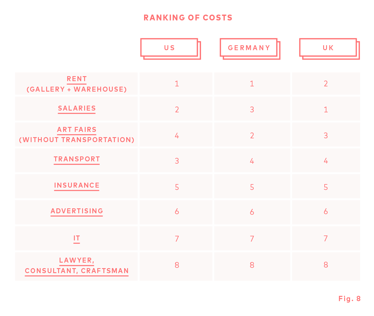 Following the assessment of a low economic profitability, Resch suggests a number of recommendations, which he has formulated from his observations. By studying the expenses of the galleries, Resch listed the rent as one of the highest expenses (first in the United States and in Germany. According to him, central premises in a major city cannot be justified with an economic rationale: it’s the offered objects that should attract potential buyers and not the location of the gallery.