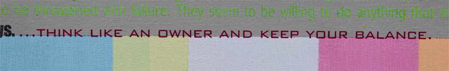 McGinity’s work sets the scene for a good debate, selecting tasty morsels from financial journalists, MPs and bankers. He wittily records their conflicting explanations and commentaries, opinions straight from the horses’ mouths. Voiced with a myriad of intersecting quotes taken from an extensive range of media, each work considers one particular aspect of the whole sorry tale. The viewer is invited to literally read between the lines where euphemisms are out of context and undermined by themselves. Laid out in broad daylight, these lip-smacking quotes splice the recent events together; colourful excuses rehashed through laser-cut stencils across fourteen panels.