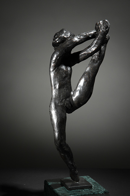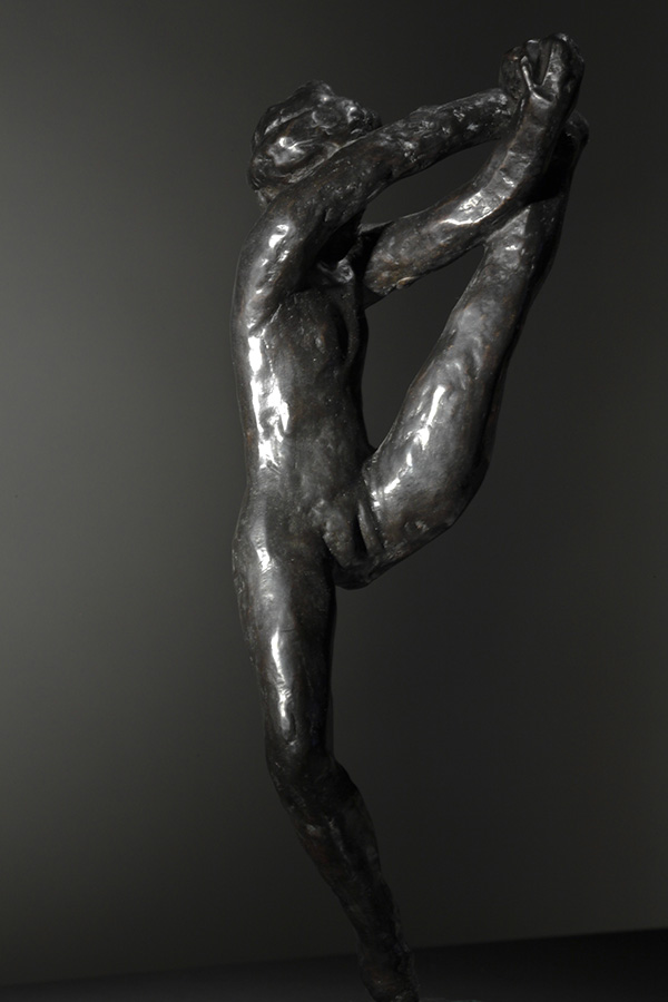 Not caring to finish the right foot or to model other parts of the body in detail, Rodin has captured the energy of an instant. The figure is asymmetrical and open when viewed from the right side and balanced and closed when viewed from the left. The treatment has the qualities of a rapid drawing rendered through three dimensional materials. |