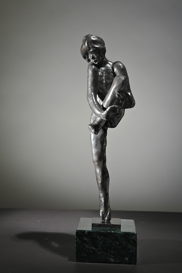 Using an economy of means, Rodin has rendered a simple warming-up exercise. The figure pulls in her raised leg with both hands in order to flex her knee. The exercise is not part of a dance but preparatory to it. In making his "snapshot in clay" from which this plaster was molded, Rodin created a compact form with most of its mass and complexity on the top of the figure. |