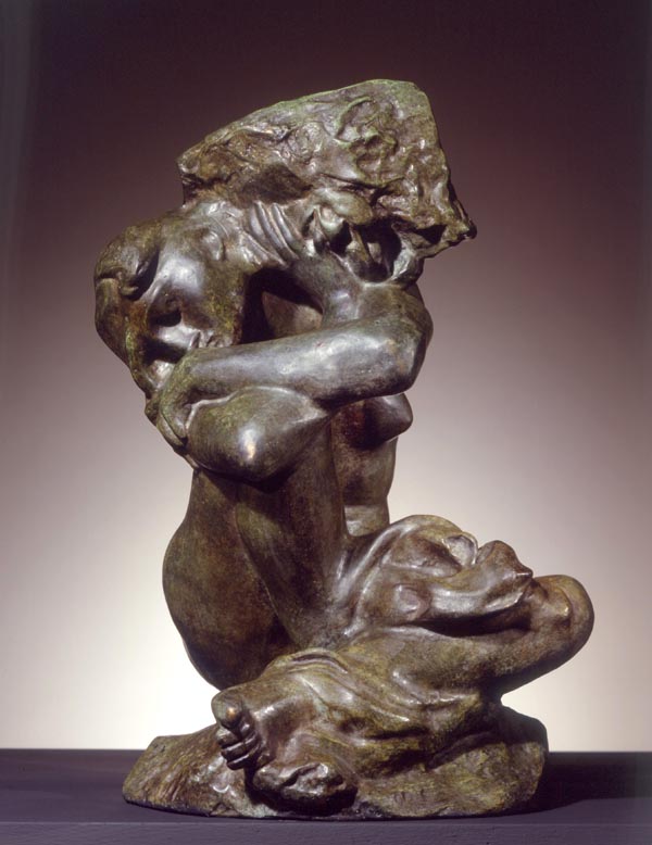 The work is an assault on, and deconstruction of, a twenty-five-hundred-year-old Western tradition of the standing female figure as a graceful architectural element. In Brussels, Rodin had executed caryatids, and he knew very well the series that was among the most renowned works of Carrier-Belleuse. For Rodin, the building that Fallen Caryatid is supposed to support has collapsed, yet the women, half-crushed, must still bear the weight of the stone.