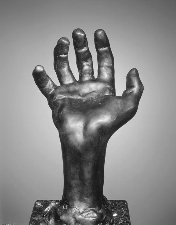 Is this hand clutching or unfolding? Reaching upwards or pulling something downward? In this study of a hand, Rodin creates fortuitous ambiguities. We may interpret it in a number of ways and may see its form a complete and self contained or as a fragment. It is an excellent example of Rodin's idea that a detail or single motif may suggest a range of meanings. |