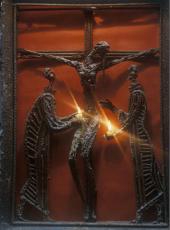 In the late 1960s Christian themes began to appear in Silis's artwork, with the first work in this vein his "Crucifixion" (1969). The reliefs made of chamotte and smalt - "The Entombment" and "Lamentation" (both from 1970) - are so memorable precisely due to the formalist contours of the figures and the fluency of the features. The next project was the iron piece "Parasceva" (1971), a piece also marked by the sculptor's original style: his is not a canonical image of the saint, and his treatment differs from that of the church. "Parasceva" is emphatically much larger than the two male figures by her side: her body is taller, the arms longer than normal. She seems to be towering over the men, defending them, begging the Lord's forgiveness for people's acts. The material and the welding technique enabled the sculptor to avoid naturalism in the saint's image. The uneven and coarse texture of the iron produced the effect of concealment of a naked body.