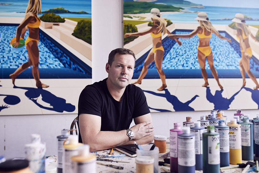 The Maddox Gallery are delighted to announce that British painter Will Martyr is the newest member of the Maddox family. Known for his dreamlike landscapes of luxury locations, Martyr's work depicts universally familiar moments of rest, relaxation, and reflection. About The Artist Seductive, relatable, dreamy, Will Martyr’s paintings depict singular moments of escapism that aim to represent those idyllic and profound moments of our lives. Featuring both urban and natural landscapes, the cropped compositions capture universally familiar moments of rest, relaxation, and reflection, in environments of unparalleled luxury. Some of these sites are recognisable, while others are hybrid locations, encouraging the viewer to transpose their own experiences and memories onto the compositions. At first glance, his meticulously painted works seem graphically composed. Yet the almost flawless surface of his canvases are the product of his laborious painting process of masking and layering. Over the past two decades, Martyr’s work has been placed in some of the most prestigious private, corporate, and institutional collections across the globe. “These poolside compositions are designed to be familiar and safe, reminding the viewer of places they have loved and laughed”. Will Martyr was born in Eastbourne in the United Kingdom in 1980. At the age of 18, he was accepted into the prestigious Slade School of Fine Art in London. During his time at The Slade, the artist experimented with colour, drawing on influences from Ellsworth Kelly, Josef Albers and Richard Diebenkorn. Martyr calls himself a colourist to this day. Following his time at The Slade, Martyr moved to New York to live and work. The city inspired him with its diverse and rich art scene and its juxtaposition of architectural genres and scale. This fed into Martyr’s early architectural paintings. Martyr returned to London in 2005 to complete his education at the Royal College of Art. He still lives and works in London today. Martyr’s illustrious education has had a profound effect on his practice. From the unconventional shape of his circular canvases, named tondos, to the hard-edged qualities of his painting, reminiscent of Pop-Art, Modernism and Italian Futurism, his artwork is heavily influenced by the history of art. Over the years, Will Martyr’s subject matter has largely been urban and natural landscapes: windows into utopian environments, fragments of interiors and narrative cut-outs. However,recently, the artist has introduced a human figure in his compositions. His wife has been his latest muse in the creation of his alluring paintings which bear titles such as “Something Special”, “Dancing across the water” or “Wherever you are its alright”.
