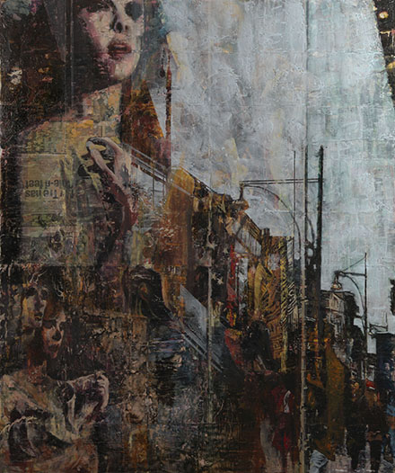 AFSHIN NAGHOUNI ‘I used to be very cautious about telling people of my accident and having people know that I am in a wheelchair because I have never wanted people to feel sorry for me. But now that things are finally moving in the right direction for me I feel comfortable enough to talk about my tragedies which have led me to triumphs and I am only looking forward to putting more of my work out for all to see. The point of my work is not to send a sort of powerful message, the point of my work is to make my audiences stop and question what they see, and to become challenged by my work – and if that happens to people then I think I have done my job as an artist’. Afshin Naghouni Iranian by birth, artist Afshin Naghouni (Ash) now lives and works in London. Considered a child prodigy, Ash had won a number of regional and national painting competitions between the ages of 9 and 12, but arrived in England with nothing after an accident that left him wheelchair bound. He applied for political asylum and lived in a nursing home for over two years until his application was processed, selling paintings on the street in order to buy more art supplies and cigarettes. As a result of the accident, he naturally began to execute bolder and more expressionistic brush strokes. Finding support initially through the Prince’s Trust, Ash was mentored by John Ritchie and worked for five years in setting himself up. Today, his vast canvases are the foundation for layers upon layers of oil, resin and glossy photographic imagery. Western women flaunt themselves in various stages of undress while Eastern women peer out modestly from their burqas, and we are forced to consider the nature of exploitation and oppression in the artist’s enhanced versions of reality. |