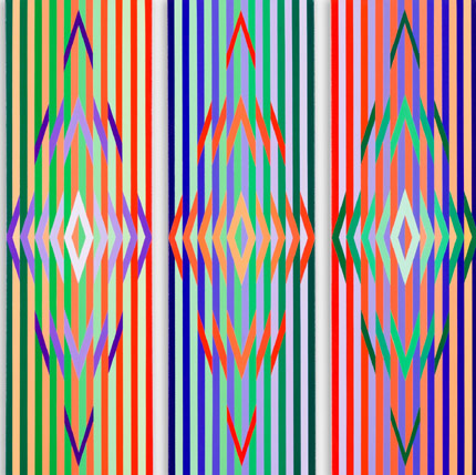 Further to this, he subscribes to the belief that the fundamental principles and language of painting are paramount in the conception and execution of art works. He produces highly finished work with geometrical precision and striking, scintillating colour palettes. All works are acrylic on canvas.