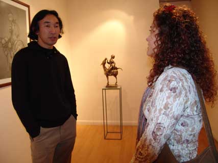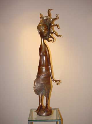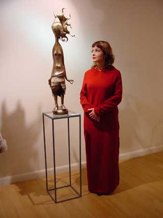 ONCE again Hay Hill Gallery has brought to London the delights of Russian Art with this stunning exhibition of Dashi Namdakov sculptor and alchemist. Namdakov's lyrical and liquid figures cast in bronze and silver conjure the vast expansiveness and mystery of Russia's non-western plainsmen and indigenous people. Dashi Namdakov, born in 1967, lives in the South Eastern part of Russian Siberia, in the Chita region, near the Russian-Chinese border in a small Buryati village near the world's cleanest and biggest fresh water container, Lake Baikal. His father was a well-known village craftsman with versatile talents, making things by hand, furniture, metal handles, carpets and wood-carved sculptures. Working At 18 Dashi moved to Ulan-Ude, Buryati's central city, and started working with the well-known sculptor Gennady Vasilyev. Two years later he entered the University of Fine Arts in Siberia's Krasnoyarsk City, where famous Russian artists Lev Golovnitsky, Yuri Ishkhanov, Azat Boyarlin and Eduard Paklhomov taught his academic art. Dashi Namdakov has been nicknamed the alchemist, observing the beauty of the natural world around him and recreating it in metal. His roots take in both the ancient traditions and the modern history of his country and culture. You find in his sculpture a mix of traditional images of remote Mongolian steppe civilisation from Central Asia - its warriors and beauties, its shamans, totemic animals and mythological creatures. His creations delight the eye and the imagination, making us believe in the reality of story telling. His pieces are strongly influenced by the oriental culture of the east where man and the universe are united, and where everything is an integral part of the ‘universal construction’, and yet he was influenced by Michelangelo. Breugel and Japanese art. Namdakov himself says: 'From my village to New York, I do not have words to describe the distance.' But his technique and craftsmanship, his knowledge of contemporary and modern art forms, testily also to the unifying process of the Soviet workers' revolution of October 1917, which liberated the peasant from ignorance and brought education, art and literature to the remote parts of the region. A revolution which made it possible for a young 'peasant lad' from the remotest inhabited regions to develop and train in the leading Art School in Siberia and to show his art in the State Hermitage, the State Museum of Oriental Art, and the Russian Museum of Modern Art. Dashi Namdakov transforms metal into silky creatures with a liquid and lyrical movement, imagined figures are made extremely tactile. His creatures have a tremendous energy and a magical power to awe, but with a lightness and humour, which delights the eyes and tickles the mind. Warriors and archers feature in Namdakov's work, broad and powerful and yet whimsical and mystified, pitted against a more powerful and mysterious natural world. For the artist, the concepts of a warrior and a sage were one. There are many horses in Dashi's work, reflecting the life of the Mongolian herdsman. In one Chinese legend a Stallion falls in love with his Master's daughter and was shot with an arrow for his troubles. But the Stallion’s skin wraps up the girl and carries her into the steppe where she is transformed into a a strange creature – a huge mulberry silkworm with a horse head, becoming the Goddess of silk-spinning. There is the delightful work called, The Rich Fiancee, in which a young woman riding a stylish mule, laden with a small travel trunk, twists on the horse, looking back at a crowd perhaps as she commences her journey. The ass she rides twists its neck 180 degrees to face the rider, but its eye looks out at the viewers, to bring them into the joke. The Pearl depicts a young woman balanced lightly on a plinth, toes curling upward and skirt blowing round her knees, her head turned away, and in her hand a large pearl. This was cast in three different colours of bronze, highlighting and shadowing and giving the sculpture a depth of texture. The Steppe Nefertiti is the head of a Mongolian woman in the style of the famous Egyptian queen. She is beautiful and peaceful and calm. Dashi prefers to work in bronze as the most visually expressive material. But he has used other materials and techniques. Two of his pieces The Bet and Raven-bird are made of felt and horsehair. Not exhibited but seen in the catalogue. Also featuring in this small friendly gallery hanging above his sculptures are Namdakov's giclee prints of his warriors. This is a new printing technique developed in France where pencil drawings can be projected onto canvas. Dashi creates his own mythology. He re-organises anthropomorphic features and invents fantastic bodies. She-Guardian is a sabre-toothed, winged, wonderful, mythical gargoyle-like creature with eight milk-full teats prancing on claws, staring wide-eyed and warning anyone who comes near. Suggesting the power of nature and of human sexuality, his erotic He and She of redwood and bronze are facing each other - two statues with the heads of gazelles and human bodies, one with women's breasts and six teats, the other with a full erection. The sculptor said: 'Each thing or idea has its own inner logic which dictates the form of expression ... by understanding and following the logic one creates a wholeness out of details.' This is a delightful exhibition and well worth a visit to this friendly gallery.