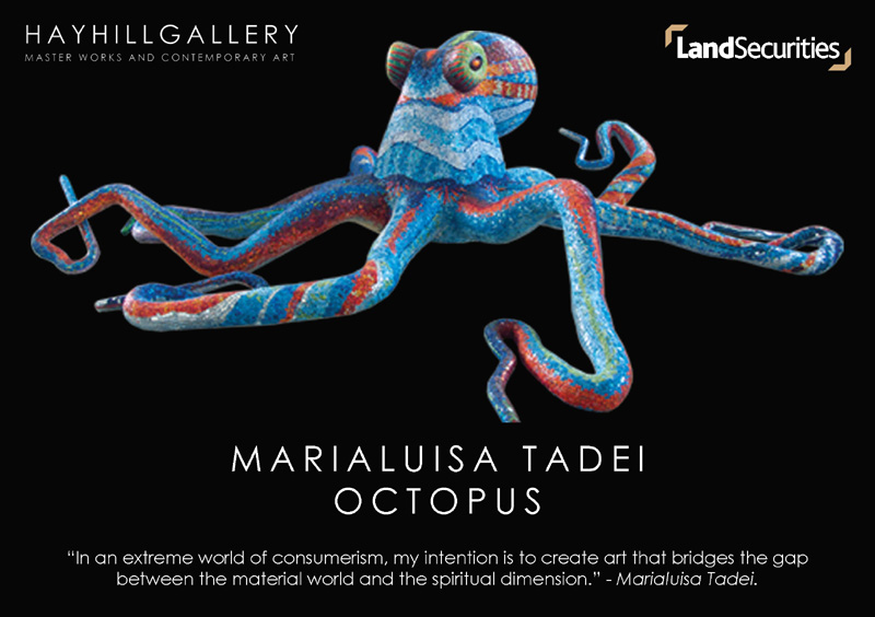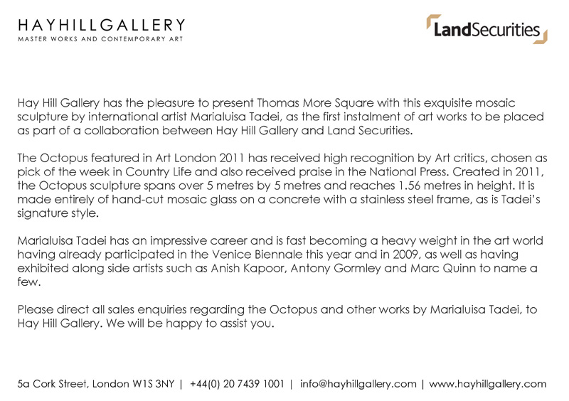 The work seeks to bridge the gap between the material and spiritual worlds in response to the extreme consumerism of the modern world. The installation is created entirely of hand-cut coloured-glass tiles, laid as a mosaic over a concrete and steel frame. Octopus is the first of two installations by Maria Luisa Tadei on the Land securities site on public display in London. The scheme is the product of a unique partnership between Land Securities and Hay Hill Gallery, of Cork St. Andrew Sell, Asset Manager Director at Land Securities, commented: “We are delighted to welcome Octopus to Thomas More Square – Marialuisa Tadei is one of the most exciting young sculptors now working on the world stage and it is a great coup to have such a significant installation on show at Thomas More Square. Public art is a key element that helps elevate the space around us into a place with a real identity of its own. Land Securities has long been committed to introducing public art at our properties – most notably in the case of Gavin Turk’s landmark creation Nail at One New Change – and we are very excited to be working with the Hay Hill Gallery on a programme of new exhibitions and installations at our developments across London.”