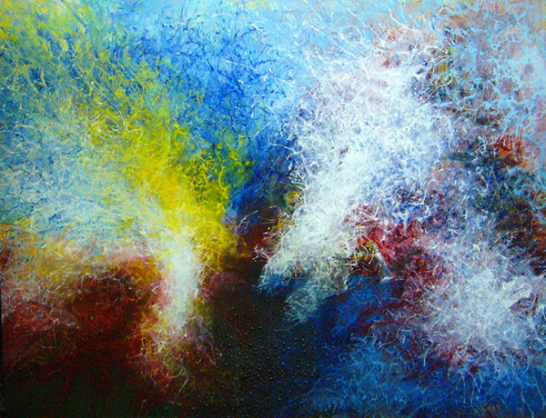 Maurizio Camatta’s ‘Electrical Storms’ provide a heady contrast. There are fireworks imploding in the damp fog; stars bursting or dissolving into Northern Lights; games of volumes and signs; contrasts and bright chromaticisms- but look closer and see a sinister order to the ‘chaos’. Camatta’s style may appear wildly haphazard, but every shade and overlap is engineered to achieve the emotional response. His expressive art is pure science: The paintings do not end in the traditional sense, but are designed to resonate with the viewer long after.