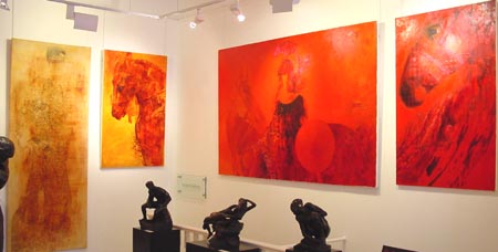 The central approach behind this particular exhibition is the heraldic use of colour: the simple juxtaposition of two or three colours to create an instantly recognisable motif. The cornerstones of the exhibition are four paintings of knights, paired together and shown in a frozen movement midway to each other, a journey whose culmination we cannot witness, but whose vibrating energy is expressed through the layers of detail placed over, and interacting with, the contours of each figure.