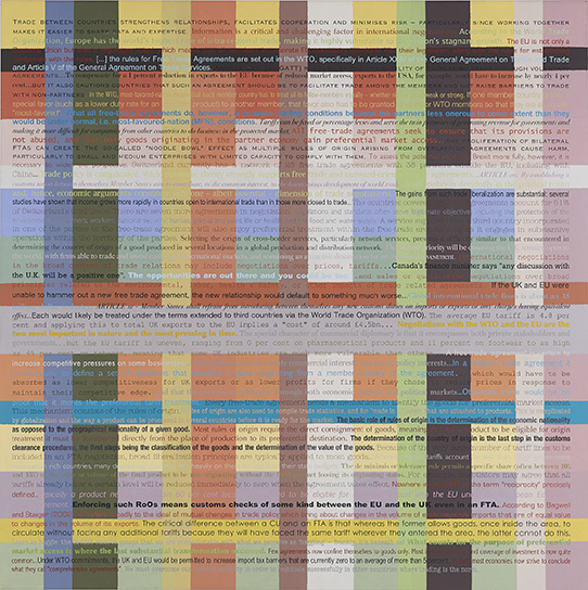 In the immediate aftermath of the June 23rd referendum on EU membership, Art as a Derivative embarked on a deep exploration of the rules and regulations, opinions and prejudices integral to trade negotiations. Particular attention was also paid to EU protocols and directives in the trade sphere and the rules governing World Trade Organization membership. Vital concepts such as Rules of Origin and Most-Favoured-Nation status were explored.