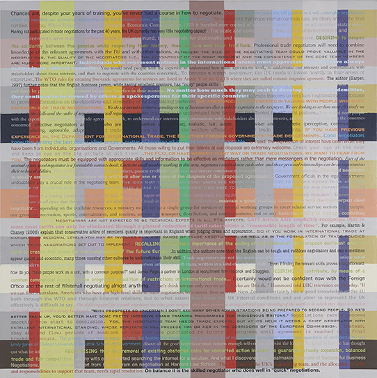 Each of the eight 1-metre-square paintings explores a different aspect of the negotiating process in some 1,500 words of verbatim text. These texts are crafted into "dialogues" where opinion, past experience, rules and regulations and headlines meet and connect over a grid of intersecting brightly coloured columns.