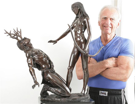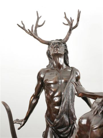 Sculptor’s Interpretation: “I have been greatly influenced by Bernini’s marble masterpiece of APOLLO AND DAPHNE in the Galleria Borghese, Rome. Apollo, Diana’s twin brother, also god of archery and of the sun, was the victim of Cupid’s (Eros) golden arrow which made him fall madly in love with the beautiful nymph, Daphne. However, Cupid shot Daphne with a lead arrow to make her reject Apollo, so we have the climax of Apollo’s fiery passion and Daphne’s cold resistance. The conclusion: just as Apollo grabbed Daphne she called upon her father, Peneus, the river god, for help, and she was immediately transformed into a laurel tree. Thereafter, in perpetual eternal mourning for his lost love, Apollo wore a headband of laurel leaves. “The Master Bernini successfully captured the moment and the metamorphosis when Apollo grabs Daphne who is turning into a laurel tree before his eyes. “My interpretation of ACTAEON’S metamorphosis starts with a very regal, very angry DIANA, whose nude privacy has been invaded by the eyes of a man. She has stepped out of her bath. Her long wet hair clings to her body. Her first instinct as goddess of the hunt was to grab her bow and destroy ACTAEON with one of her silver arrows. Instead, she decides to spare the handsome hunter’s life by throwing water on him, turning him into a stag, not realizing that his own hunting dogs would turn on their master. “My DIANA casts her spell on ACTAEON who kneels at her feet, helpless, pleading for mercy as the metamorphosis starts to take place, full stag’s horns already sprouting from his head. “I’m no Bernini, but I think I captured the moment. “This is intended to be my last DIANA. However, when I was recently in London, I photographed the current Miss Universe, who has also been a ballerina. If I can work out logistics so she can pose for me, there may be a Fourth DIANA.” RICHARD MINNS