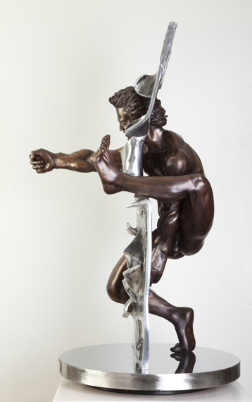 Leon Bronstein The above tribute to Richard’s skills is easily evidenced by his Atlas Shrugged Quadrilogy. In Richard’s hands, clay, wax, plasticina, bronze, stainless steel, brass and aluminum have been transformed into figures that manifest the human condition. Richard understands the possibilities of the male and female nude and the spectacle of muscles in movement. Every inch of Richard’s Atlas Shrugged sculptures, from head to toe, convey the total spectrum of human emotion. ATLAS SHRUGGED I: ESCAPE TO FREEDOM literally EXPLODES with POWER as Richard’s Atlas SMASHES his way out of the word, reaching out to FREEDOM. Richard’s Atlas I is the embodiment of physical force. As you turn the sculpture around on its turntable, you will note from Atlas’ toes to his fingers, from his calves to his thick legs, powerful buttocks and explosive back, every muscle in Atlas’ body is in play. Atlas I is Richard’s opportunity to display his mastery of human anatomy and to show an athletic young male body at the height of physical excellence. Atlas is cast in Bronze with a classic rich dark brown patination. The Wall (representing the world of Collectivism) is cast in highly-polished Aluminum, reflecting a mirror image of Atlas. The Base is highly polished Stainless Steel, also reflecting a mirror image.