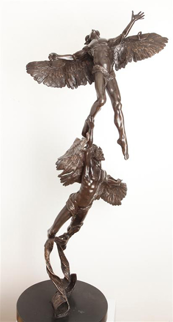 SCULPTURE’S DESCRIPTION Icarus is at the top, exhilarated with his ability to fly, and he is flying straight for the sun … and his doom. His father, Daedalus, is flying safely below, right arm outstretched high, holding his son’s ankle, attempting (in vain) to restrain him. Actually, Flying Too High (Daedalus and Icarus), where Icarus is flying straight for the sun and his father Daedalus is frantically trying to restrain him, is a companion sculpture to Icarus’ Final Moment, where Icarus (in mid-air), is about to crash into the sea, his body contorted in perfect Greek Pathos, his melted wings hanging limply under him. This sculpture is first a masterpiece in engineering and architecture. In order to show Dadealus and Icarus soaring high in the air and to create the illusion of defying gravity, Daedalus is flying in one direction and Icarus is flying in the opposite direction, creating a horizontal “V” shape so that the center of gravity is perpendicular to the center of the two bodies allowing the sculpture to stand solid and firm, but clearly giving the illusion of defying gravity … and FLIGHT! The relationship of the bodies of Daedalus and Icarus has maximum grace and fluidity of form, expressing power, emotion, conflict and maximum movement. It is a beautiful ballet of forms in the air. The expression on Daedalus’ face, anguish and concern over the fate of his disobedient son, is in contrast to the expression on Icarus’ face, exhilaration and rapture in his freedom of being able to fly. This is the original prodigal son story. The surface modeling is vintage Richard Minns at his best. No detail is overlooked … from Daedalus’ windblown hair … to Icarus’ wild hair covering his left eye … to every feather on their wings … to the stirrups which hold the wings to their arms. Nothing misses Richard’s watchful eyes. This sculpture LIVES! ARTIST’S