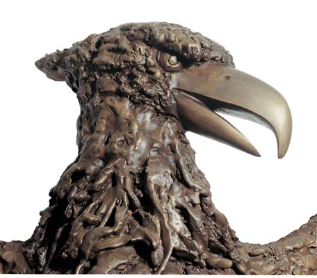 “I formed the original sculpture 100% in wax and was able to produce some unusual effects, which one cannot achieve in clay or other media. For example, for the large wing and tail feathers, I poured out sheets of molten wax, then I hand-carved every single feather, carving each rib in each feather. After which I carefully sculpted them together. There are over 80 individual feathers. I let the wax melt and run when I sculpted the legs, talons and the neck feathers, to achieve a very impressionistic effect.”
