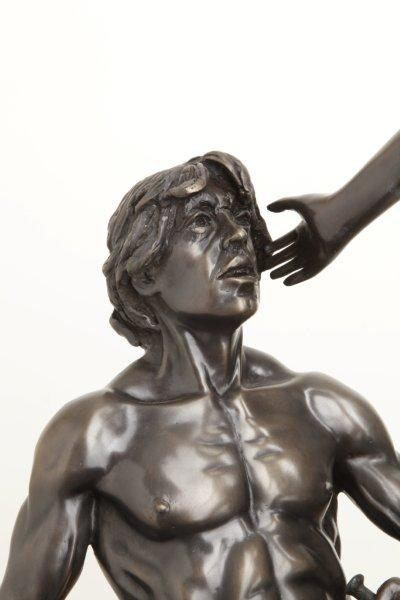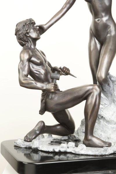 RICHARD L. MINNS Medium-size table top bronze. Classic potash rich dark brown patination on Pygmalion and Galatea. Black patination on Pygmalion’s sculptor’s tools. Special grey/white marble patination on ground and marble part of Galatea’s statue. 79 cm high x 54 cm long x 37cm wide, 31 in high x 21 in long x 15 in wide. CLASSICAL MYTHOLOGY As written in Ovid’s Metamorphosis, Pygmalion was a very handsome and very famous young sculptor in ancient Cyprus who wanted to marry and raise a family, but he could not find a woman who measured up to his standard of perfection. Therefore, he summoned all of his great skills and created the perfect woman out of a block of marble, then falling hopelessly in love with his creation. Pygmalion prayed to Aphrodite (Venus), the goddess of love, who gave the marble statue the gift of life. Pygmalion took his creation in his arms and since her fair skin was as white as milk, he named her Galatea, after the Greek word for milk. They had a son, Paphos, and the Cyprus city of Paphos bears his name to this day, preserving the story for all eternity. DESCRIPTION OF SCULPTURE The basic Pygmalion story has made its influence in literary / art / musical history more than any other Greek myth as each generation of artists, sculptors, writers, poets, playwrights, composers and musicians continue the Pygmalion concept in art, sculpture, literature, theatre, opera and cinema. First to come to mind is George Bernard Shaw’s award-winning play “Pygmalion”, which was turned into the award-winning stage and screen musical “My Fair Lady”, starring Rex Harrison as “Professor Higgins” and Audrey Hepburn as “Eliza Doolittle”. The seemingly endless list of branches from the Pygmalion tree includes “Phantom of the Opera”, “Educating Rita”, Nathaniel Hawthorne’s “The Birth-Mark”, Oscar Wilde’s “The Picture of Dorian Gray”, “Pinocchio”, even Mary Shelley’s “Frankenstein” and even the Simpsons’ episode entitled “Pygmoelian”. Artists and sculptors who have given their interpretation of Pygmalion include Auguste Rodin, Francisco Goya, Honoré Daumier, Edward Burne-Jones, Paul Delvaux, among countless others. Richard now enters the classical ring with his interpretation. Richard’s Pygmalion, his sculptor’s chisel in one hand and hammer in the other, is kneeling before his marble creation of Galatea, making the final touches. He hears a movement and laughter above him and looks up to see to his surprise and delight that Venus (Aphrodite) has granted his prayers and his creation has come to life. Galatea, laughing, reaches out to her lover, touching his cheek. To effectively portray this metamorphosis, Galatea’s upper half (the part which has come alive) is in bronze (like Pygmalion), where the lower part of her legs is still in marble. To create contrast and drama, the ground is white marble, which stands out on the ivory black polished base. Pygmalion’s sculpture tools are scattered on the white marble ground. The tools are covered with a black patina, in stark contrast to the white ground. Pygmalion and the part of Galatea which has come alive has a classic potash rich dark brown patination to effectively portray Galatea’s metamorphosis. Now the beauty of this magnificent bronze and marble sculpture is that the sculpture is 100% bronze and there is no marble on it. The white marble block, which Galatea is breaking out of, and the white marble floor is not real marble. Richard can create a bronze sculpture which looks identical to marble. This is the beauty of having a patination master and Richard’s foundry has one of the best in the world. ARTIST’S INTERPRETATION “I am an ex-Journalism professor and a frustrated “Story Teller”. I get great pleasure writing stories and reading them, first to my children (now grown), then to my grandchildren (now grown), and presently to my great grandchildren.” “The purpose of my sculptures is to tell a story. If my sculpture needs to be explained to the viewer, then I have failed. My sculpture stories are about the heroes of the Bible and the heroes of classical mythology. (Of course, it helps if the viewer knows the story.)” “My interpretation of Pygmalion is a young, handsome sculptor with a pleasing trim athletic body, but certainly not a Hercules, Samson or an Achilles. Galatea is the perfect woman – or at least Pygmalion’s concept of the perfect woman for him. Slim, feminine, with large eyes and Angelina Jolie lips.” “By casting the entire sculpture in bronze and relying on my patination expert to simulate marble, I was able to show a mixture of classic potash and white patina slowly blending together on Galatea’s legs. Look close. I think you will like it.” “I could say more, but I will let me sculpture speak for me. If you feel I have effectively told the Pygmalion story, then I have succeeded.”Richard L. Minns