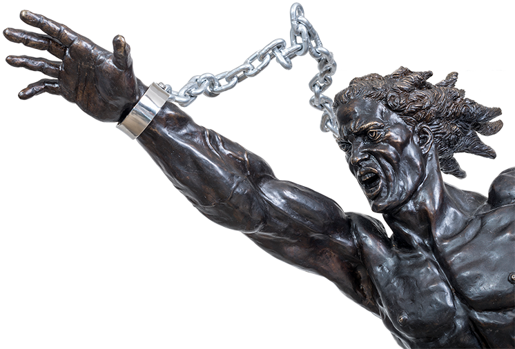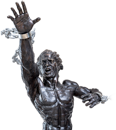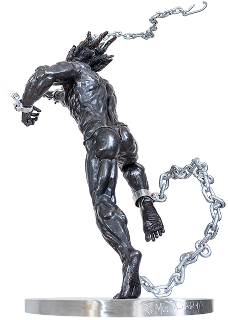 "My SPARTACUS, the ‘Ultimate Warrior’, has broken loose from the chains which bind him, and he is escaping to freedom. The chains, which fly in the air as he runs and charges forward, are an integral part of the sculpture.  His every muscle, ligament and tendon strain to anatomical perfection."