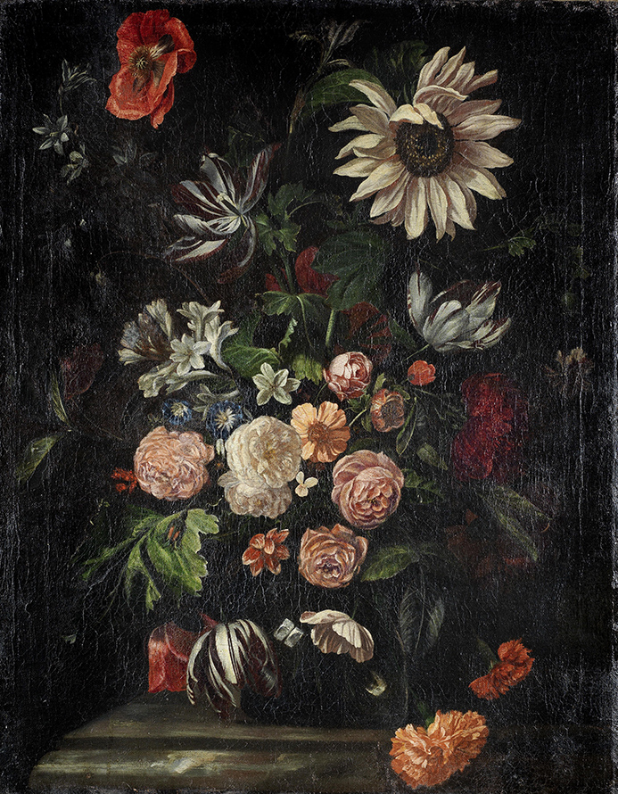 'Flower Still Life', oil on canvas, 90 x 70 cm Ernst Stuven (ca.1657–1712) was a German Baroque flower painter. According to Houbraken, he was born in Hamburg, where he was initially trained by Georg Hainz. At the age of eighteen he moved to Amsterdam (ca. 1675-1677), where he became a pupil of Johannes Voorhout, who he knew from Hamburg. Being more interested in flower painting, he soon joined the studio of Willem van Aelst, and after a period with him, he switched to Abraham Mignon. His works sold well and he got married, and though Houbraken mentions children, no known sons are listed as pupils. Houbraken mentions in his biography of Elias van den Broeck that he had been Stuven's first and best pupil (ca. 1665). Stuven's pupils according to the RKD (Netherlands Institute for Art History) were Herman van der Mijn, J.W. Windtraken, and Willem Grasdorp. Houbraken wrote five pages about the abusive relationship in 1697 between Willem Grasdorp and Ernst Stuven. When Grasdorp tried to escape, Stuven prevented this and when Grasdorp's mother called upon the authorities, Stuven was so aggressive to them that he was sentenced for 12 years in the Rasphuis in Amsterdam. He was allowed out for good conduct after half of that time, and was taken in by Romeyn de Hooghe in Haarlem (ca. 1703-1705). He later moved to Rotterdam, where he painted for a gentlemen named De Beer who kept him for a ducat per day and room & board, which is where he later died. From Wikipedia |