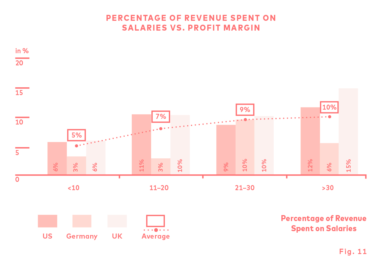 The survey also demonstrates that there is a correlation between the galleries’ employees’ salary and its revenue. According to Resch, a higher salary attracts better qualified people and improves the profitability of the gallery. In his article “Why Do So Many Art Galleries Lose Money?”, James Tarmy emphasises that the link between the two is not that obvious: it’s more likely that because the galleries are profitable they can pay their employees higher salaries.