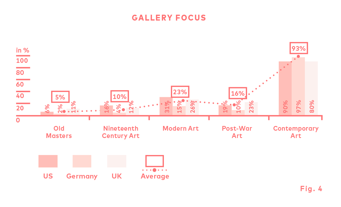 Finally, Resch focuses on the structure of the galleries’ business: the majority of the galleries (93 %) are specialised in contemporary art. Resch points out that there are too many contemporary art galleries compared to the number of buyers. He suggests that it would be smarter to turn to other less competitive segments of the art market. However, James Tarmy explains that contemporary art is in high demand, and if there are that many galleries specialised in that sector, it’s to meet the demand. Specialising in a different sector would thus not increase the volume of sales nor the profitability of galleries.