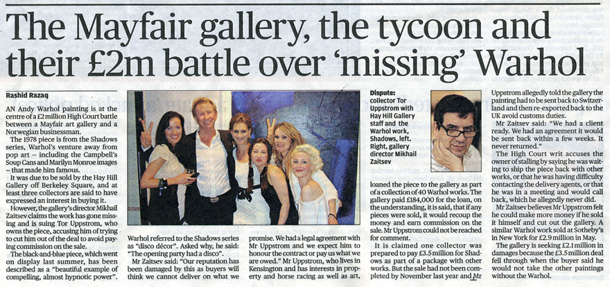 http://www.standard.co.uk/news/the-mayfair-gallery-the-tycoon-and-their-2m-battle-over-missing-warhol-6433354.html An Andy Warhol painting is at the centre of a £2 million High Court battle between a Mayfair art gallery and a Norwegian businessman. The 1978 piece is from the Shadows series, Warhol's venture away from pop art - including the Campbell's Soup Cans and Marilyn Monroe images - that made him famous. It was due to be sold by the Hay Hill Gallery off Berkeley Square, and at least three collectors are said to have expressed an interest in buying it. However, the gallery's director Mikhail Zaitsev claims the work has gone missing and is suing Tor Uppstrom, who owns the piece, accusing him of trying to cut him out of the deal to avoid paying commission on the sale. The black-and-blue piece, which went on display last summer, has been described as a "beautiful example of compelling, almost hypnotic power". Warhol referred to the Shadows series as "disco décor". Asked why, he said: "The opening party had a disco". Mr Zaitsev said: "Our reputation has been damaged by this as buyers will think we cannot deliver on what we promise. We had a legal agreement with Mr Uppstrom and we expect him to honour the contract or pay us what we are owed." Mr Uppstrom, who lives in Kensington and has interests in property and horse racing as well as art, loaned the piece to the gallery as part of a collection of 40 Warhol works. The gallery paid £184,000 for the loan, on the understanding, it is said, that if any pieces were sold, it would recoup the money and earn commission on the sale. Mr Uppstrom could not be reached for comment. It is claimed one collector was prepared to pay £3.5 million for Shadows as part of a package with other works. But the sale had not been completed by November last year and Mr Uppstrom allegedly told the gallery the painting had to be sent back to Switzerland and then re-exported back to the UK avoid customs duties. Mr Zaitsev said: "We had a client ready. We had an agreement it would be sent back within a few weeks. It never returned." The High Court writ accuses the owner of stalling by saying he was waiting to ship the piece back with other works, or that he was having difficulty contacting the delivery agents, or that he was in a meeting and would call back, which he allegedly never did. Mr Zaitsev believes Mr Uppstrom felt he could make more money if he sold it himself and cut out the gallery. A similar Warhol work sold at Sotheby's in New York for £2.9 million in May. The gallery is seeking £2.1 million in damages because the £3.5 million deal fell through when the buyer said he would not take the other paintings without the Warhol. |