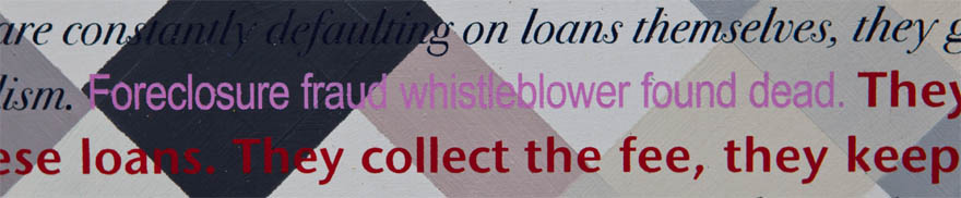 McGinity’s work sets the scene for a good debate, selecting tasty morsels from financial journalists, MPs and bankers. He wittily records their conflicting explanations and commentaries, opinions straight from the horses’ mouths. Voiced with a myriad of intersecting quotes taken from an extensive range of media, each work considers one particular aspect of the whole sorry tale. The viewer is invited to literally read between the lines where euphemisms are out of context and undermined by themselves. Laid out in broad daylight, these lip-smacking quotes splice the recent events together; colourful excuses rehashed through laser-cut stencils across fourteen panels.