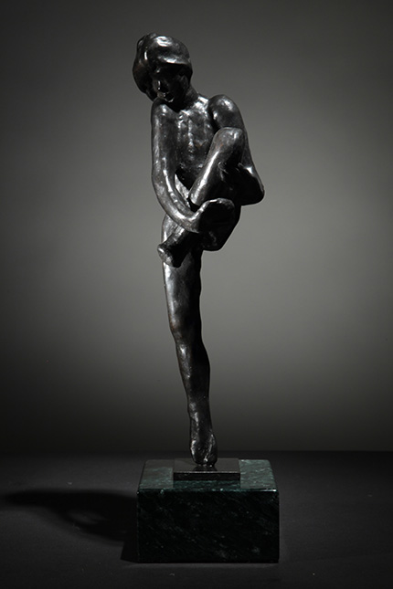 Using an economy of means, Rodin has rendered a simple warming-up exercise. The figure pulls in her raised leg with both hands in order to flex her knee. The exercise is not part of a dance but preparatory to it. In making his "snapshot in clay" from which this plaster was molded, Rodin created a compact form with most of its mass and complexity on the top of the figure. |