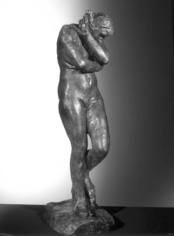 Like The Age of Bronze and St. John the Baptist, Eve is one of Rodin’s grandest standing figures. Resigned, sorrowful, and tentative, Eve contains her emotion. She shares such internalization with some of Rodin’s greatest figures, The Thinker and Jean d’Aire from The Burghers of Calais among them. Eve embodies a pessimistic view of human fate, a pessimism that was to deepen with Rodin’s reading of Dante. The first model for Eve was Adele Abruzzezzi, a young peasant woman from the mountains of central Italy. Rodin explained the lack of finish, visible in both the face and body, as a result of Adele’s leaving his studio because she had become pregnant. For the slightly later, smaller version of Eve, Rodin employed a thinner English model. This second version of the pose is more refined: the form is made more sensuous by Rodin’s softening details of the anatomy and by his reducing the accidents and animation that characterize the surface of the larger figure. |