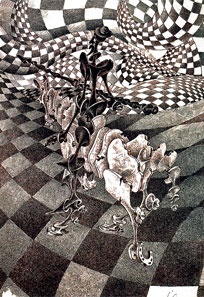 But Silis is not known for his work in sculpture alone. In 1976, he created a series of witty lithographs portraying Don Quixote in contemporary situations. “What I wanted to express in these engravings is Cervantes’ sarcasm, humor, and depth,” he said. So in Don Quixote on a Chessboard the character finds himself in a chessboard universe that exists in several dimensions at the same time. Unable to tell top from bottom, Don Quixote nevertheless maintains his fighting spirit, posed on horseback and holding a lance. “We’re all Don Quixotes in a way and may always find ourselves in surreal situations like that,” commented Silis. In the Ecological Don Quixote, Cervantes’ picaro is set against a big industrial town pumping out black fumes. He tries to hide behind a dilapidated wall, surrounded by garbage and broken bottles, but there is nowhere to go.