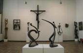 In the late 1960s Christian themes began to appear in Silis's artwork, with the first work in this vein his "Crucifixion" (1969). The reliefs made of chamotte and smalt - "The Entombment" and "Lamentation" (both from 1970) - are so memorable precisely due to the formalist contours of the figures and the fluency of the features. The next project was the iron piece "Parasceva" (1971), a piece also marked by the sculptor's original style: his is not a canonical image of the saint, and his treatment differs from that of the church. "Parasceva" is emphatically much larger than the two male figures by her side: her body is taller, the arms longer than normal. She seems to be towering over the men, defending them, begging the Lord's forgiveness for people's acts. The material and the welding technique enabled the sculptor to avoid naturalism in the saint's image. The uneven and coarse texture of the iron produced the effect of concealment of a naked body.