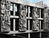 That relief was not the sculptors' only creation to be destroyed. The same thing happened to the stone mural "Old Russian Warriors" (1966) inside the building of the Arbat restaurant. The unaccomplished projects included the design of the Olympics office on Gorky Street and the front wall of the main office building of the car maker AMO ZIL (both from 1966), as well as reliefs for the Oktyabr Cinema (1967). For the last project, a revetment was built to carry reliefs featuring scenes from films, which were initially made of clay and then molded; the final product was to be made of stone23. Shortly before Lemport's death the revetment was gifted to the Mosfilm film studio. Another dismantled piece was an iron sculpture mounted in 1967 on the front of "Dom Svyazi" (Communication House), on Kalinin Prospect (now Novy Arbat, 2). The Minister of Communications Psurtsev disapproved of the iron emblem shaped by Silis as a female figure - he believed it looked too frivolous. The piece was removed from the outside and mounted inside the building, but unfortunately it has not survived. The design for the Russian National Library of Foreign Literature (1967) remained unrealized as well.